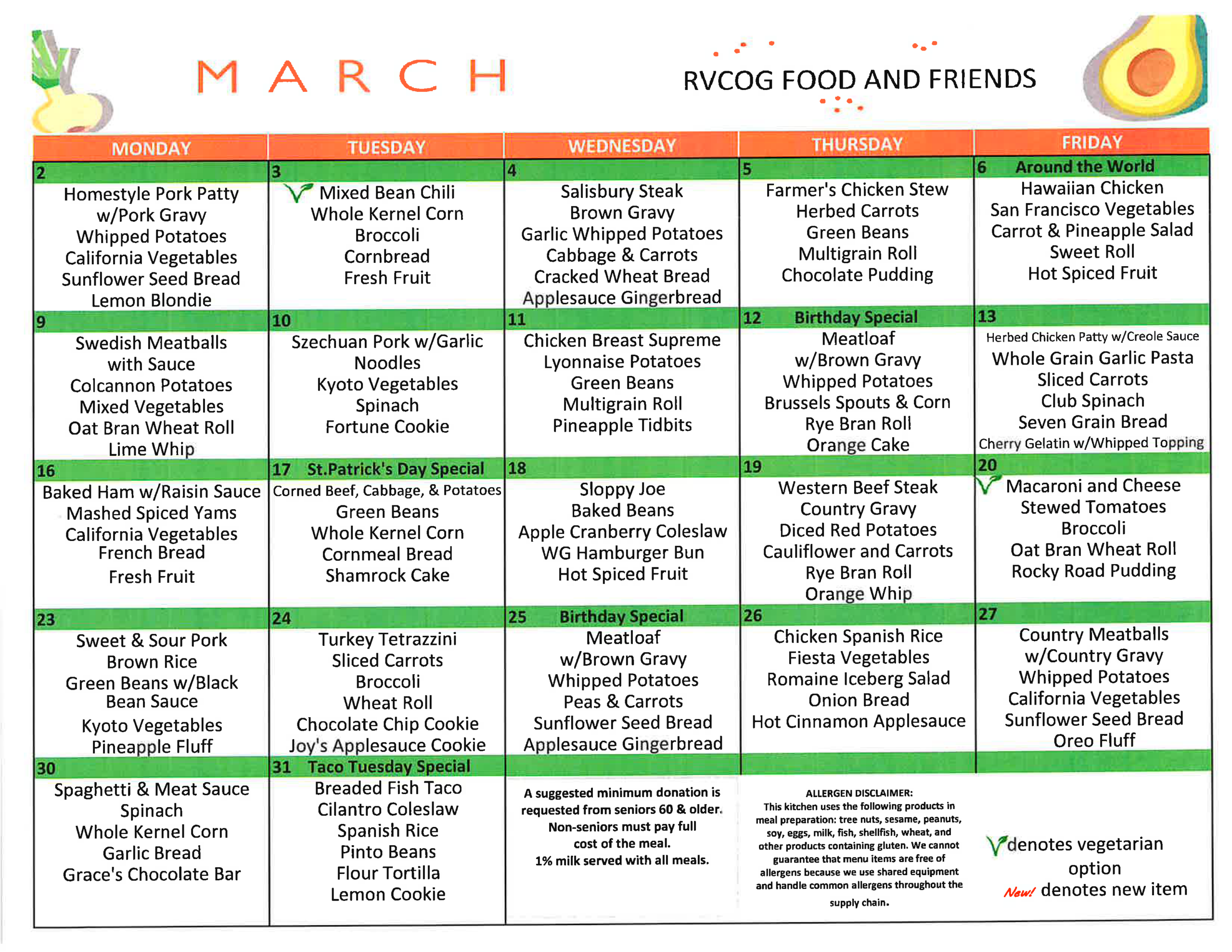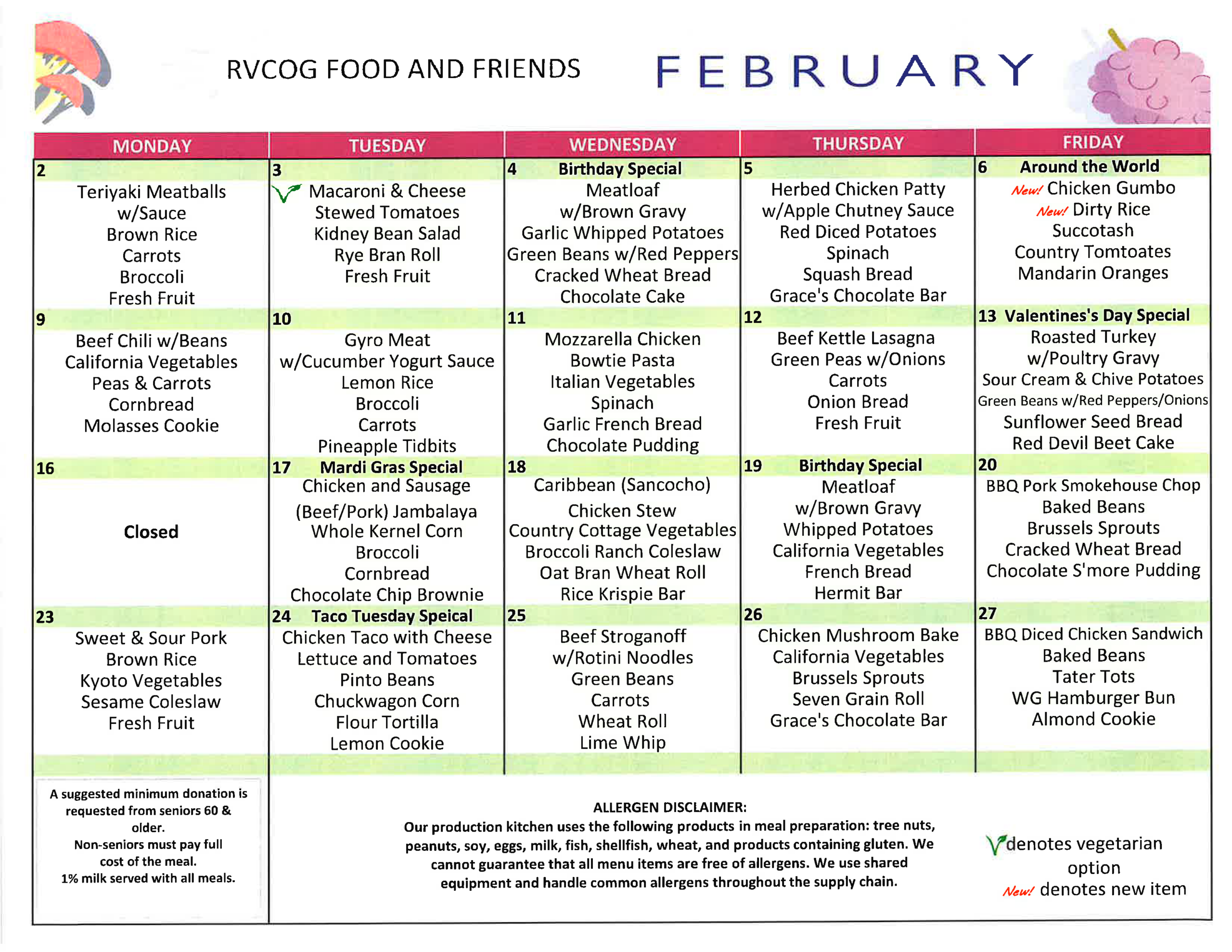 - Hot and frozen meals contain an entrée, two vegetables or fruit, milk, bread and a dessert.